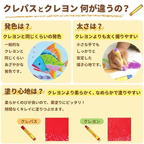 【セット色】24色セット 【特長1】のびのびと自由に描けるように作られたクレパス 【特長2】均一なやわらかさなので、混色・重色が自由にできる 【特長3】子どもたちの手に合わせた太さとやわらかさ/折れにくく、面塗りも線描きも自由自在 【単品サイズ】Φ11×71mm/本