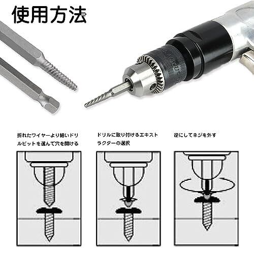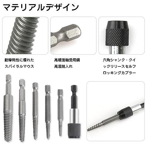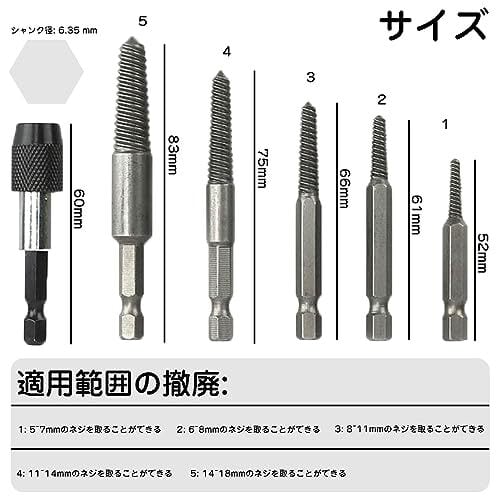 [キット構成]:スクリューエクストラクター5本とセルフロック式カップリングロッド1本で構成 [寸法]:スクリューエクストラクター:1 # 52 mm、2 # 61 mm、3 # 66 mm、4 # 75 mm、5 # 83 mm、セルフロック・リンケージ:60 mm シャンク径:6.35 mm [材質]:ベアリング鋼材、焼入れ処理後、高硬度、良好な靭性、耐摩耗性、損傷したネジを除去するためのツールとして、優れたパフォーマンス [設計と使用]:六角シャンク径設計、安定したサポート、高速回転、均一な力で 、ドリルやその他の工具で穴の開いたネジに穴を開け、引き抜き器を穴に打ち込み、回転して引き抜く 操作が簡単 [使用範囲]:以下の用途に使用錆びたネジ、壊れたネジ、動かないネジ、破損したネジ 仕事でも家庭でも、この製品は大きな助けとなるだろう
