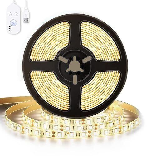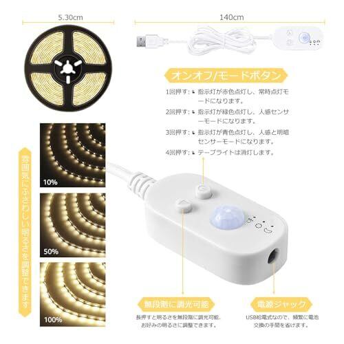 【三つモード・無段階調光】常時点灯・人感センサーモード人感と明暗センサーモードと三つのモードがあります、人の動きと明暗を感知すると自動で点灯します。調光機能については、三角形マーク付きのボタンを長押すと明るさを無段階に調光可能できます。高質高輝度のLEDチップを300個採用して、高輝度になり、幅広く細やかな色温度(3000k)調整が行えます。 【防水等級IP55】IP55の防水性能あるのグルーがプリント基板を完全に覆われていますので、屋内と屋外の場合にもふさわしくて、雨や雪に耐えることもできます。(LEDテープライト上にジェルをポッティング保護をしたジェル防水タイプです。水中でのご使用はできません。) 【簡単設置】強力な両面粘着テープが付属して、取り付けやすいし、手軽に固定することができます。優れた柔軟性が持ちので、自由に曲がれてお好きな形を調整可能です。またテープライトをより安定させるためにコードクリップが付属され、お好きなところに思う通りに取り付けます。また、簡単に取り外すことができ、家具を傷めたり、痕がつかなく壊すことはありません。賃貸の方にもお勧めします。「ご注意:切断したら、残った部分は再利用することができません。」 【低消費電力】5メートル当たり15W、1日8時間点灯で電気料金が3円となります。一般照明より省エネ、発熱量も少なく、節電効果が抜群!また、USB給電式で、わずか5Vの低圧なので安全性をアップさせます。USB給電式なので、電池が不要で、頻繁に電池交換の手間と電池を買う金が省けます。環境にも優しいし、家庭用ledライトとして最適です。※出力電流2.1A以上の充電器で接続することをお勧めします。出力電流2.1A以下の充電器を使用すれば、電流不足で光が弱くなるかもしれません。 【多場所適用】パスライト、アクセントライト、バックライトに最適で、キャビネットライト、バニティミラーライト、ルームライトなどの下で広く使用されています。寝室、壁、階段、玄関、キッチン、クローゼット、トイレ、本棚など様々な場所で間接照明や装飾として大活躍です。白色系のLEDライトはバー、レストラン等の店舗インドア、看板、壁面アイキャッチ、什器照明、作業台照明、ショーケース照明、棚下照明、ディスプレイ、読書、流し元などにも適用する。