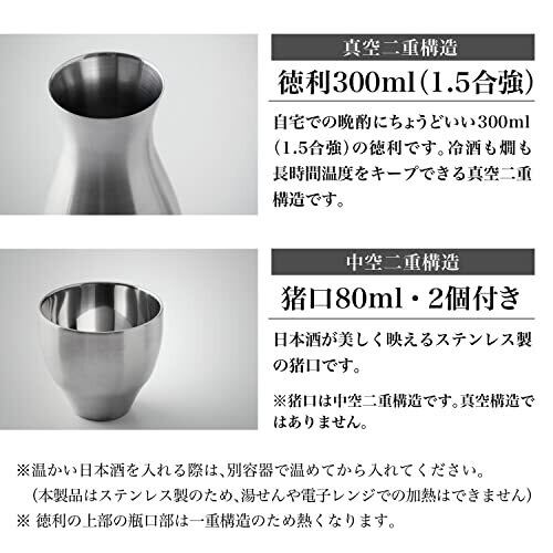 徳利/サイズ(約):幅6.8×奥行6.8×高さ16.1cm・口径 3.4cm・実容量 300ml、猪口/幅5.9×奥行5.9×高さ5.3cm・口径 5.5cm・実容量 80ml 本体重量(約):徳利/185g、猪口/40g 徳利・猪口/ステンレス鋼 生産国:中国 保温効力(徳利):1時間/63度以上、保冷効力(徳利):1時間/7度以下