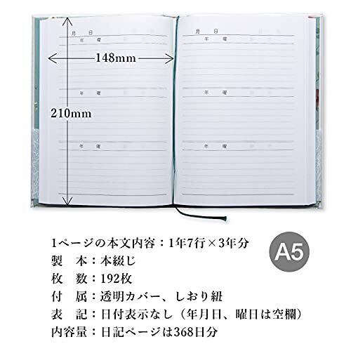 【本体サイズ】 A5(21.0cm×14.8cm) 【内容】 1年7行×3年分=1ページ 【製本】 本綴じ 【とじ枚数】 192枚 【付属】 透明カバー、しおりひも 【表記】 日付表示なし(年月日、曜日空欄)