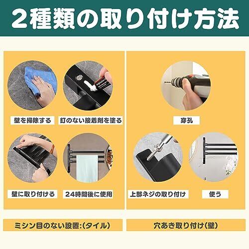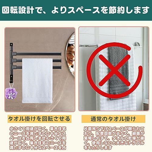 【高品質な素材】タオル掛けは優れたスペースアルミニウムで作られています。構造がしっかりしており、頑丈で耐久性があり、腐食や錆びに強く、湿気の多い環境でも使用できます。タオルハンガーはタオルや衣類の収納に非常に適しており、浴室、キッチン、寝室などで活用できます。 【180度の柔軟な調整】回転式のタオルハンガー 洗面所は、浴室のスペースを節約し、複数の家庭のニーズに対応します。タオル掛け 洗面所はタオルの重なりを防ぎ、より速く乾かすことができます。 【穴あけ不要の取り付け】タオル掛け 粘着に接着剤を塗り、壁に押し付けて、タオル掛けと壁がしっかり密着するようにします。72時間待ち、接着剤が完全に乾燥するまで、バスタオル掛けは重さを支えることができます。 【多機能】キッチン タオル掛けは多くの用途に活用できます。コート、衣類、傘、タオルなどさまざまなアイテムを掛けるのに非常に適しています。また、タオルバーは浴室、寝室、廊下、エントランス、キッチンなどでアイテムを整理するための優れた選択肢となります。 【温かいお知らせ】タオルハンガーを取り付ける前に、壁面が乾燥していて清潔であることを確認してください。タオルバーに関するご質問はいつでもお気軽にお問い合わせください。お問い合わせいただいた内容に対して、24時間以内に満足のいく回答をさせていただきます。