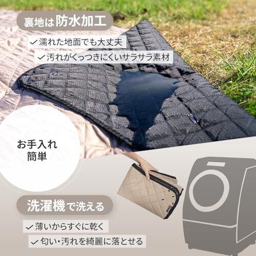 【1~3人用】展開時:200cm×150cm/収納時:直径18cm×長さ42cm(重量:約1.0kg 付属品込み) 【素材】表面:シャリシャリの心地良い肌触りで通気性が良く、汗をかいた素肌で触れても”ぬるっ”としません。/中綿:中綿を詰めていますので軽度のクッション性があります。スポンジに比べて畳みやすく、通気性も良いのが特徴です。/裏面:防水加工(PUコーティング)を施していますので水たまりの上に敷いても染みません。ピクニックや日帰りレジャーならこれ1枚でOKです。 【おすすめ用途】ピクニック、花見、花火大会、運動会等のイベント行事、テント内のインナーシートとしても使えます。カップル、親子に最適な広さです。 【収納袋付き】シート本体と同じ素材で出来た収納袋が付属します。シートに付いた土汚れを包み込めるので車内・家の中へ汚れを落とさずに済みます。持ち手付きなのでお子様でも負担なく持ち運べます。付属のペグ、ベルトを袋にまとめて保管できるため紛失しにくいのもメリットです。 【重量】約1.0kg(シート本体、ベルト、ペグ×4本、収納袋 全て込み) 【デメリット】クッション性は少ないためキャンプで就寝する場合には別途インフレーターマット等が必要です。その代わりに「コンパクト」で無駄にかさばらないのが強みです。 【水洗いできる】汚れや匂いが気になったら洗濯機で丸ごと洗濯できます。シートを蛇腹に畳んだ状態で洗濯ネットへ入れて別の衣類と分けてください。中性洗剤のみを使い、手洗いモードで優しく洗濯することをおすすめします。洗濯後はシワになりにくいように伸ばして干してください。(ポリエステル製のためアイロンは使えません。)