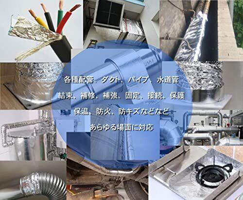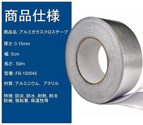 【サイズ】テープ幅:5㎝ 長さ:50m 厚さ:0.15㎜ 【大容量50m!!】 ◉不燃性ガラス繊維を使用しており、耐熱や防火を要する箇所の使用に最適です。また強粘着アクリル粘着剤を使用しており、安定した粘着性能を発揮します。 ◉ガラス繊維が編込まれたアルミテープは耐引裂性に非常に優れています。 ◉-50℃ ~ 300℃以上と非常に広範囲な温度帯でご使用頂けます。 ◉ハサミで簡単に切れますので、細かい場所への貼付にも最適です。 【用途】キッチン水回り、コンロ回り、配管やダクトの補修・補強、エアコンの配管や水道管の被覆、高温になるパイプや箇所などの補修・補強、冬季の水道管凍結防止保護など保温を要する箇所の保護、すき間埋めなど。