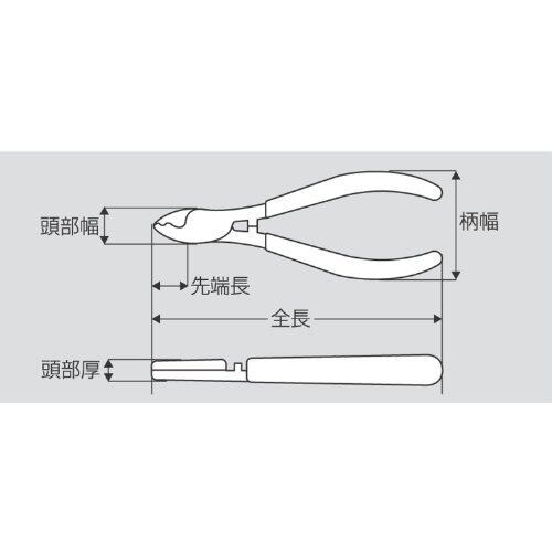 サイズ:全長210mm 頭部幅:34mm 頭部厚:12mm 柄幅:45mm 先端長:33mm 切断能力:VVF/2.6×3、ケーブル/直径9mm、IV線/22mm2 重量:285g 仕様:ケーブル(軟銅心)切断用