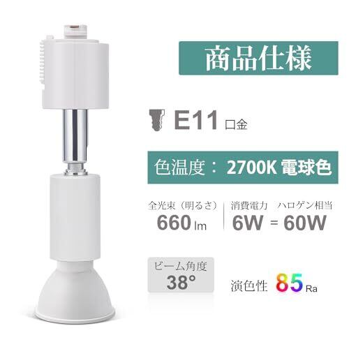 【E11 LED 電球色】6W(60W形相当)、全光束:660lm、色温度:2700k、定格電圧:100V、広角タイプ:38°、演色性:Ra85; 【ダクトレール用照明器具】定格電圧:100V、使用可能電球:150Wまで、角度調整:上下約90、回転約360度、カラー:ホワイト 【ダクトレール専用】照明器具として配線ダクトレール・ライティングレールに自由に移動でき、照射角度もシーンに合わせて調整でき、自由自在な光の演出ができます。高輝度のE11 LEDスポットライトと組み合わせて、間接照明はもちろん、直接照明にも適しています。 【チラツキなし・目に優しい】Ra85以上に達したE11 LED電球なので、肌や物の色がより美しく、自然に再現できます。フリッカーがないので、体調に悪い影響を与えません。特に、 リビング、ダイニング、キッチン、寝室、トイレや玄関などにオススメします! 【省エネ・長寿命電球】高品質なLEDチップを採用して、消費電力が僅か6Wで、従来の60Wハロゲン電球と比べ、約90%の電気代を節約できます。しかも、25000時間の設計寿命なので、短寿命のハロゲン電球より、長持ちで頻繁に交換する手間とコストを削減して、家計に優しいLED電球です。 【1年保証】ご購入日より1年間の保証を提供いたします。万が一商品に不良またはご不明なところなどがございましたら、お気軽に[email protected]までご連絡ください。