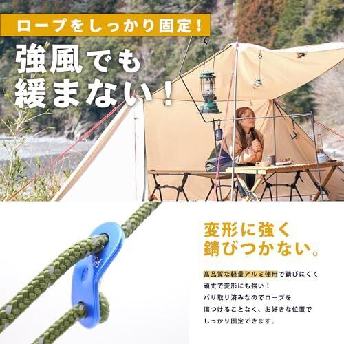 <スペック>サイズ:縦4cm×横1.6cm×穴径0.6cm 重量:2.8g 素材:アルミニウム <軽量アルミニウム>高品質な軽量アルミ合金を採用!軽量アルミニウムは耐久性に優れており変形やサビにも強く、且つ重量も僅か2.8gと軽く丈夫で軽いを両方兼ね備えています。 <ワイヤーリング付き>20個の自在金具を一つにまとめる事が出来るワイヤーリング付き!持ち運びに便利でキャンプ場などの野外で紛失も防げます! <5mmまで対応>DaLaCaの自在金具は5mmのロープまで通す事が出来る様に設計しています。細いロープから太いロープまで様々なサイズのロープにお使いいただけますので、テントやタープのロープに最適です! <バリ取り済み>面倒なバリ取り作業済み!バリによるロープの擦れなどが少ないのでロープの劣化を抑え、無駄な摩耗を起こしません!ロープを大事に長くお使いいただけます。