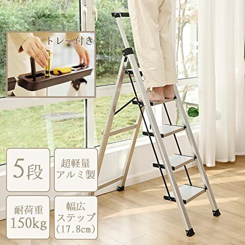 【脚立 5段】高いところのものを取るときの足立ちとして、おうちに1台あるといっても便利な脚立。サッとたたんでコンパクトになる折りたたみ式ので手軽に持ち運べる優れ脚立です。 【伸縮式手すりの設計】自由に選択可能な持ち手があって、昇り降りも安心して登ることができます。使用しないときは脚立の手すりを収納可能、隙間に収納して便利です。収納時は厚さ約6.2cmとスリムなサイズ。 【ワイドステップの安心設計】ステップ台には滑り止め加工を施しました。靴下のままでも安心してお使いいただけます。一般の脚立より広く作られているため、安心して足を乗せることが出来ます。耐荷重約150kgと、安全性にも優れています。 【適用範囲】エアコン掃除、車の洗車、電球を交換、高い所の窓拭き、食器棚の上棚の収納、倉庫・店舗内作業など様々な用途に。あらゆるシーンに対応する、折りたたみ脚立で、家庭用におすすめです。 【脚立仕様】サイズ:幅48cm×奥8cm×高さ143cm 本体重量:約6.7kg。耐荷重:150kg。「注意」A.脚立のハンドルを引き出した後、ビードが溝に詰まっていることを確認してください。B.PVCアウトリガーを不適切に使用すると、はしごが左右に揺れます。足が地面に完全に接触していることを確認してください。C.使用するときは、はしごが完全に開いていることを確認してください。
