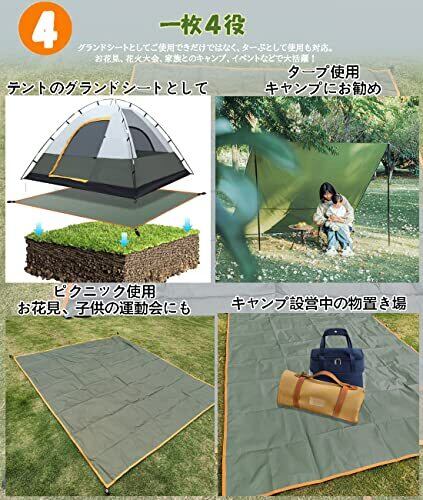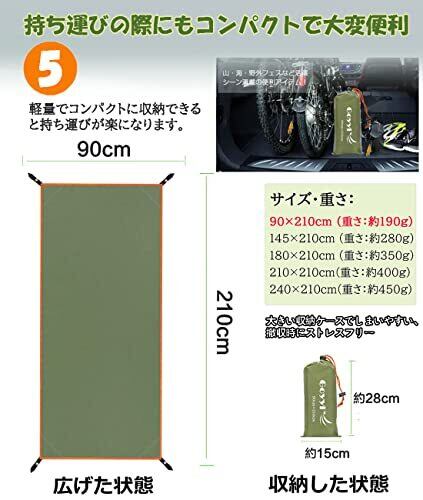 【高い防水性テントシート】こちらのテントシートは210D引き裂く防止のオックスフォードを採用し、シートの裏面はシルバーコーデイング加工が施されていて、PU3000mmの高い耐水圧機能を備えた製品です。濡れた場所にも使えるテンドシートです。 【使い勝手に優れたグランドシート】展開サイズは五つあり、(90x210cm/145x210cm/180x210cm/210x210cm/240x210cm)好きにサイズを選んでいただけます。1-8人に対応可能です。折り畳み式なので、収納もとても便利です。グランドシートを使用することで、浸水や地面からの湿気を遮断可能。 【幅広く応用できるレジャーシート】桜の季節、お花見、ピクニック、紅葉狩り、花火大会、運動会、浜辺に最適。グランドシートをテントの下に敷くことでテントの底に汚れや傷などがつくのを防げます。または、急な雨に雨宿り、防災用品として常備してていただけます。 【小型で軽量、持ち運び便利】専用の収納袋に小さく収納できるので、持ち運び便利だけではなく、省スペースで軽量で携帯しやすいです。リュックに入れたり掛けたり、アウトドアで持ち運びに便利です。車に常備すれば、いつでもどこでもピクニックを楽しめます! 【お手入れ簡単】 速乾性に優れ、汚してもすぐ簡単に拭き取ることができます。アウトドアの場合や雨が強い日でも清潔で快適にご利用いただけます。