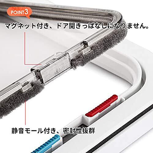 猫・犬用ペットドア キャットドア。取り付けネジ、両面粘着テープと当店(NETKEY)独自の日本語取扱説明書付き。 サイズ:25×23.5×5.5cm(外寸) 21×19cm(出入り通路) 壁厚さ:15mm~50mm対応 重量:約490g 材質:フレーム(硬質プラスチック)、フラップ(半透明ポリカ製、周囲はモール付で隙間少なく、空調に効果あり) 開け閉め:マグネット式。ロック、フリー、出、入の4種切替