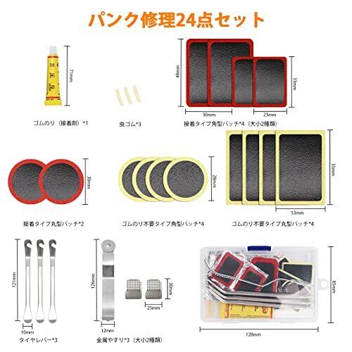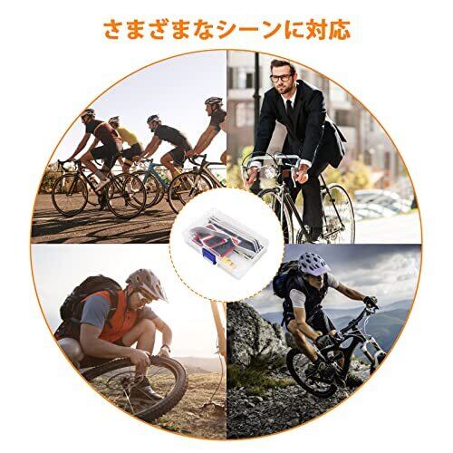 24点パンク修理セット:自転車のパンク修理キットには14枚2種類のパッチ、3つの金属タイヤレバー、1本のゴム・のり、3つのやすり、3つの虫ゴムが含まれています。自転車パンク応急修理対応できます!通勤、通学のバックに入れておいて自転車に乗ることも心強い! 2種類パッチ付き:パンクセットには2種類の異なるパンクが含まれており、それぞれ異なる用途のシーンで使用されます。高圧タイヤは接着タイプパッチ、低圧タイヤはゴムのり不要タイプパッチに適しています。緊急時にはゴムのり不要タイプパッチを使うことをおすすめします。 タイヤレバーは、金属製で、プラスチックのように切れやすくなく、タイヤを取り外したり、取り付けたりするのに役立ちます。 この自転車パンク修理セットは、軽くて小さく携行生が良いので、ツーリングや通勤などに携行するのに便利です。緊急時に使うためのものですので、常に持ち運ぶ必要があります。ロードバイク、クロスバイク、マウンテンバイク、ママチャリまで自転車大部分で使用でき、様々な自転車のタイヤに勝手に切り替えてとても役に立ちます。 幅広い場面:日常の通勤、スポーツ愛好家、自転車旅行者など、頻繁に自転車を乗る人々にとっては最適です。また、自転車のメンテナンスや修理に興味がある人にとっても役立ちます。簡単で使いやすい道具や材料が提供されるため、自宅で手軽にタイヤ修理を行うことができます。