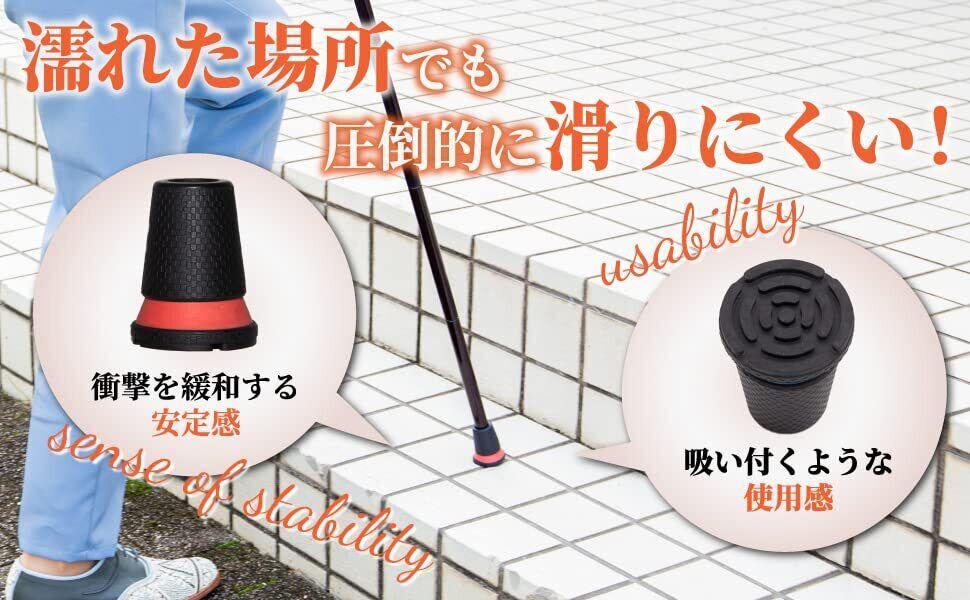 ✅滑りにくい驚きのグリップ力で、雨で濡れた路面も安定して使用していただくことができます。思わぬスリップを防ぎ、快適に使用していただけるよう、滑りにくさを追求して新しい杖ゴムを開発しました。 ✅今までにない3段構造(上段:カーボン柄の天然ゴム 中段:クッション層 下段:特殊な耐滑素材と排水パターン)により圧倒的な滑りにくさを実現しております。また、杖を突いた衝撃を吸収してくれるので、手首への負担も解消されます。 ✅一般的に市販されている外径16mm、19mmの杖に使用可能です。お使いの先ゴムと交換するだけで使い心地が各段に変わりますし、安定性も増します。 ✅他にはないツートンカラーの高級デザインで足もとからオシャレになります。性能だけではなく、見た目にもこだわった先ゴムで、お使いの杖をワンランクアップさせることができます。 ✅サイズが16mm 19mmの2種類あるのでお間違いなく。縦:約50mm。底面外径:約38mm。差し込み口内径:16mmタイプか19mmタイプ。重さ:約37g。