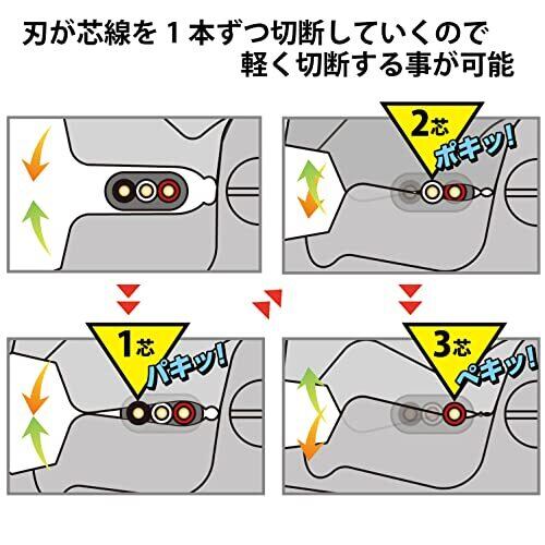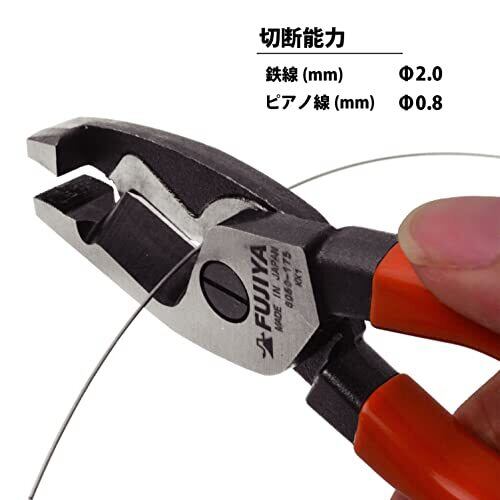 全長:183mm 重量:282g 切断能力:鉄線Φ2.0mm、ピアノ線Φ0.8mm、VA・VVF線Φ2.6mm×3芯、IV線22mm2 原産国:日本