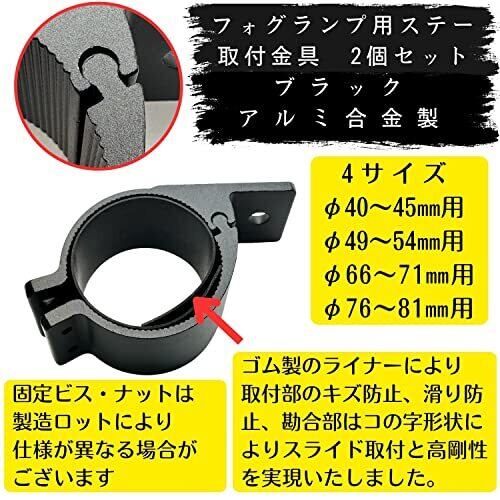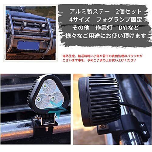 取付けステーをグリルガードやルーフラック、バンパー、パイプに装着する事でフォグランプやバーライト、アンテナ等が取り付けできます。 取付金具の内側に付属のゴム製ライナーを取り付ける事により滑り止めになり、しっかりと固定する事が可能です。 装着は上下のクランプをスライドさせる事で分割し、パイプに挟んだ状態から再度スライド式で挟み込み、後は付属のネジを締め込む事で簡単に取付けが可能です、本体側にもタップ加工をしておりますが、ナットも付属しておりますので緩みや脱落を防止いたします。※ナットは座金付きナット、スプリングワッシャータイプがあり製造ロットにより変更する場合がございます。 【サイズ】パイプサイズφ40〜45用、φ49〜54用、Φ66~71用、φ76~81用の4種類をご用意し、各種グリルガードや大型パイプにも取付可能です。ブラックアルマイト処理の2個セットとなります。 ラングラー、ジムニー、ランクル、デリカ、トラックなど、ほとんどのオフロード車やトラックにユニバーサルフィット。※取付後、車両振動や馴染みによる初期緩みが発生しますので増し締めを行ってくださいませ。