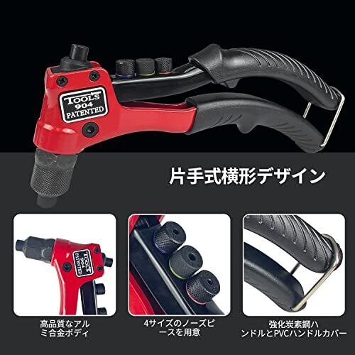 【セット内容】ハンドリベッター本体1個、ノーズピース(2.4mm、3.2mm、4.0mm、4.8mm用)各1個、リベット(2.4mm、3.2mm、4.0mm、4.8mm)各50本、ドリルビット(2.5mm、3.5mm、4.2mm、5.0mm)各1個 【素材】リベットガン本体は炭素鋼が作られ、ヘッド部分に高硬度電気めっき、防錆・耐久性あり、使用寿命も長くなります。 【デザイン】片手式横形デザインを採用、リベットに合わせやすくスムーズに作業できます。また掴むグリップが太いで手が疲れにくい。滑り止め加工のハンドルによって作業を容易にします。結合工具として自動車、航空、鉄道、エレベーター、計器、家具などにご利用いただけます。 【4サイズリベット】付属リベットボディの径は2.4/3.2/4.0/4.8mmの4サイズがあり、家庭用品の修理や自動車部品の取付など幅広い用途に対応し、身近な部材の接合にもおすすめ。 【使用簡単】従来のデザインに比べ、レンチなどの工具は必要ありません。 指だけで4種類ノーズピースを簡単に交換できます。回収ケース付なので、持ち運びやすく紛失のリスクも軽減できます