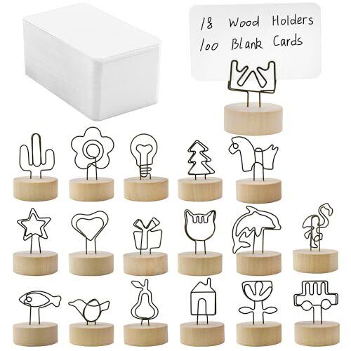 Enkrio 木製 メモホルダー メモクリップ 写真立て カードスタンド 100枚の白いカード付き 18個入り 卓上 木&金属製 メモスタンド 記念日 結婚式 パーティー
