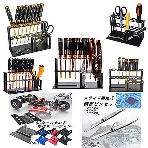 アルミ製組み立て式ツールスタンドです。 ブラック・ブルー・シルバーの3色からお選びください。 ラジコンのメンテナンスに仕様するドライバーやニッパー、ハサミ、ピンセットなどの工具を立てかけて作業効率を大幅アップ。 敷板はくぼみがあり、細かい部品などが散らばらずまとめやすくなっております。 アクリル製と違い、アルミ製なので丈夫でひび割れなどもなく、永くご使用いただけます。RCモデルカーのメンテナンスだけではなく、プラモデルや、模型製作などにもお使いいただけます。 【カラー】ブラック・ブルー・シルバー【サイズ】】195× 90× 111mm【重量】280g
