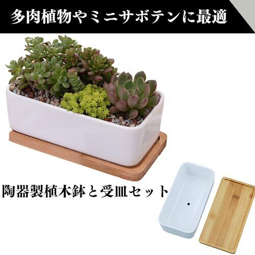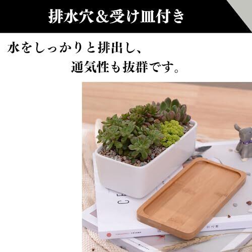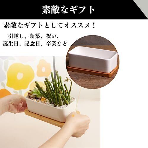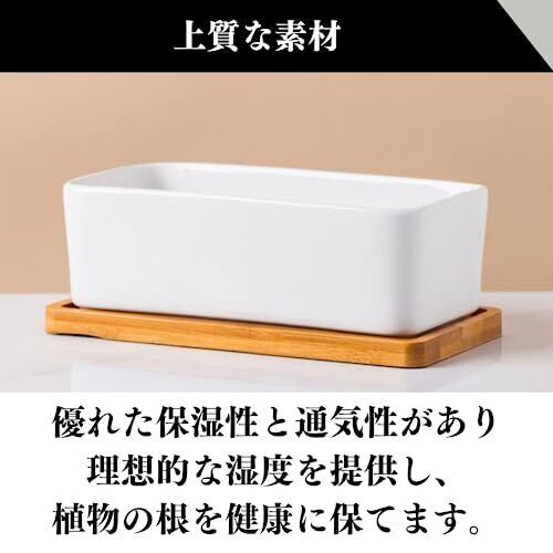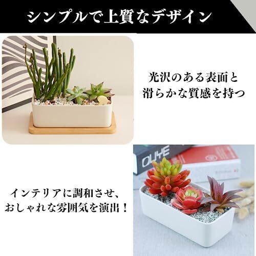【多肉植物やミニサボテンに最適】植木鉢と受け皿のセット:陶器製の長方形プランターで、ミニ観葉植物、サボテン、そして多肉植物にぴったりです。 【上質な素材】セラミック製の上質な素材から作られているので、耐久性があり、優れた保湿性を持ちながらも通気性があります。これにより、植物の根が健康で適切な湿度を維持ができます。 【シンプルで上質なデザイン】光沢のある表面と滑らかな質感を持つセラミック製植木鉢は、シンプルで洗練されたデザインであり、表面の仕上げも丁寧に行われているため、さまざまなインテリアに調和させ、高級感や洗練された雰囲気が演出できます。 【排水穴&受け皿付き】底には排水用の穴があり、受け皿も付いていますので、水をしっかりと排出し、通気性も抜群です。 【セット内容】●陶器製プランター+受皿 ●サイズ 陶器製プランター:約16.3×8.4×5.5cm 受皿:約17×8.7×1.0cm 素材:陶器+竹製
