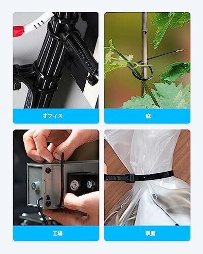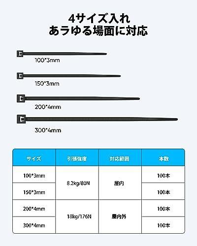 【アップグレードのナイロン素材】Highwings 結束バンドは強力で改良されたナイロン66製で、耐紫外線性と耐候性に優れています。悪天候でも安心で(対応温度範囲は -40 °C ~ +85 °C) 、極端な条件でも長期間完璧に固定することができます。 【経済的結束バンド 】4つのサイズがあり、あらゆる場面に使用でき、ホームやオフィスや作業現場やバイクなどのケーブル収納、庭や猫ケージやブラケットなどの固定し、さまざまな場面に適しており、生活に便利さをもたらします。*4つのサイズ結束バンドの中には100*30mm、150*30mm、200*40mm、300*40mm各100本を含みます。 【非常に強力な引張強度】 最大引張強度約18kg(176N)で、トリプルセレーションにより引張強度が15%~30%アップ。従来の結束バンドに比べ、柔軟性、耐久性、耐引裂性に優れています。バリがなく滑らかなテープのエッジは、使いやすくて挟傷を防止して、指や体の他の部分を傷つけません。 【高耐荷重性】 最大ループ引張強度約18kg(176N)で、トリプルセレーションにより引張強度が15%~30%アップ。従来の配線用結束バンドに比べ、柔軟性、耐久性、耐引裂性に優れています。バリがなく滑らかなバンドのエッジは、使いやすくて挟傷を防止して、指や体の他の部分を傷つけません。 【安心なセルフロックのデザイン】使いやすいナイロン製のタイラップは、セルフロック機構を備えており、時間が経っても壊れることはありません。固定したい物にタイラップを巻きつけ、テール部をヘッド部に通し、締めるだけで、素早く物を整理し、固定することができます。