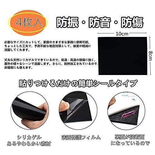 貼りつけるだけの簡単シールタイプ:裏面が接着面になっているので、保護シールを剥がして貼りつけるだけと簡単に使えます。直接カーペットやラグに貼りつけることもできますよ。 耐久性・防音性・通気性にすぐれています:指で押すとクッション性のあるやわらかい素材であることを実感できます。荷重がかかるほど吸盤効果が増すのでソファやベッドなどの固定におすすめ。 は、丈夫な天然シリカゲルでできているので、低温・高温の環境に強く、床暖房にも使えます。表面はブラックで仏壇や仏具にも合わせやすく、地震などの振動で、高価な仏具がズレ落ちたり転倒したりするリスクを軽減できます。 必要なサイズにカットして、家庭のさまざまな家具に使用可能。近年増えている地震や自然災害などで家具や家を守るためにも滑り止めシートは使えます、防災用として使っている人が増えていますよ。 10cm×8cmの正方形のシートが4枚入っ、自宅内のテレビやタンス、机といった重たいものには、耐久性もあり耐荷重も高い天然ゴム製の滑り止めシートをおすすめします。ちょうど四隅に貼れて無駄がありません。 材質:シリカゲル + #513接着剤 サイズ:10 x 8cm / 4枚入.