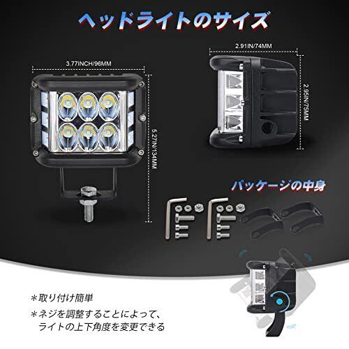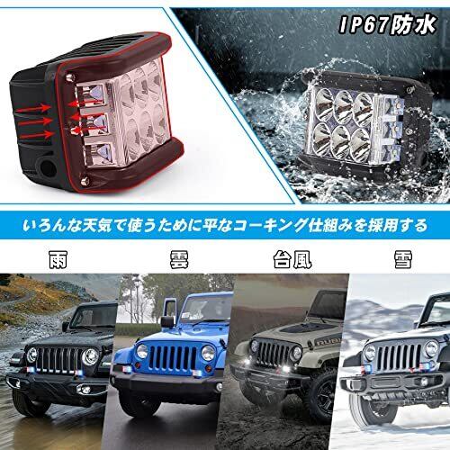 三面発光で広角照射:左右両側サイドライト+正面メインライト=半円の照射範囲。左側の発光色は赤で、右側の発光色は青です。人の視覚に強いインパクトを残る作業灯 led 12vです。 スタイリッシュ感満々:ユニークなストロボ機能を持つ。ジープなどの車に取り付ければ、車の雰囲気が変わって、もっとクールになるled作業灯 12vです。 しっかりした作り:LEDストロボライト本体はコンパクトで丈夫です。ハウジングは合金を採用してダイカストででき、気流に順応するデザインで、放熱効果は普通のledライトより強いです。レンズは厚さが高くて耐熱のプラスチックでできます。レンズとハウジングの間ではコーキング処理をしました。密封性が良くて水入りなどの心配はないです。 いろんな用途:電圧範囲は12v-24Vです。用途に合わせて様々な場所に取り付けることができるワークライト 12v 小型です。バイク、ジープ、ジムニー、緊急用車両などです。 パッケージの内容&一年保証:ledライト 作業灯 小型*2個、金具*2。もし取付時何か問題がありましたら、ご遠慮なくお問合わせください。問題を解決する為に最善を尽くすことをお約束致します。