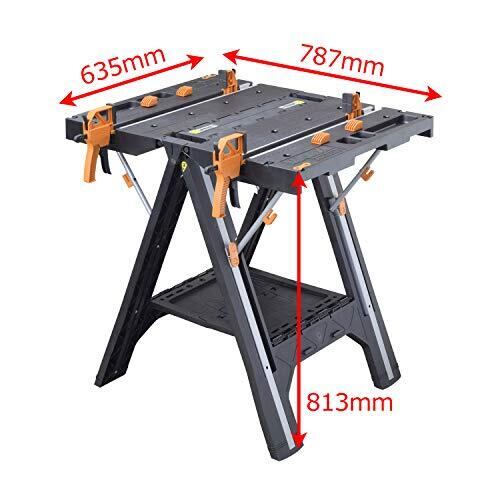 【一台二役&効率的なクイッククランプ】独創的なF型クイッククランプにより、クランプ幅を自由に調整でき、様々な形状の素材をしっかりと固定します。作業台、ソーホースとしても使えます。耐荷重は作業台として135kg、ソーホースとして450kgまで。 【広い作業面】テーブルサイズ:787×635mm。広い作業面により、多くの素材や工具を置くことができます。プロの作業や、DIY、日曜大工、アウトドアなどに適しています。 【折りたたみ式】上に持ち上げるように簡単に組み立て、下に引くように素早く折りたたむことができます。移動、収納もスムーズ。 【コンパクト&持ち運び便利】収納サイズ:635×127×889mm。省ペースで保管でき場所を取りません。車のトランクや家具の隙間、物置などに簡単に収納できます。 【人間中心設計】テーブル面には収納トレイが設けられており、クランプやビットなどの細かな工具の収納にぴったりです。電源タッブを結束バンドで固定するためのスロットもあります。作業台の下にも、工具の収納スペースがあります。そして、テーブル面には目盛も付いているため、簡易的な長さの確認に便利です。付属の4個のクランプドッグを作業台にある穴に挿入すると、円形などの固定しにくい素材もしっかり保持が可能。