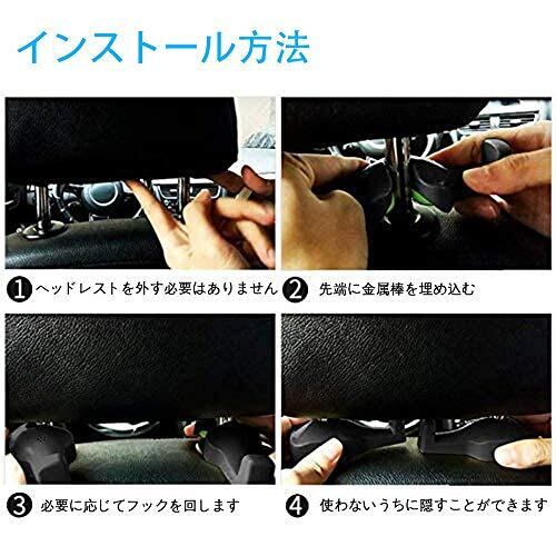 車のヘッドレストにセットして、荷物を提げられるコンパクトなフックです。 レジ袋、ゴミ袋、リュック、傘などをぶら下げるのにピッタリ。荷物を置く場所がない、あっても運転中に転がってしまう、そんな小さなイライラを解消してくれます! 取り付けが簡単、工具も不要。フックをヘッドレストのバーに当てて、奥まで押し込みます。 使用しない時は回すだけで収納できて邪魔になりません。使う時だけ回して引き出せばOK。 パッケージ内容:車用シートフック*4;最大荷重:8kg;素材:ブラスチック;背中のスムーズなデザイン、レザーシートも傷つけません。
