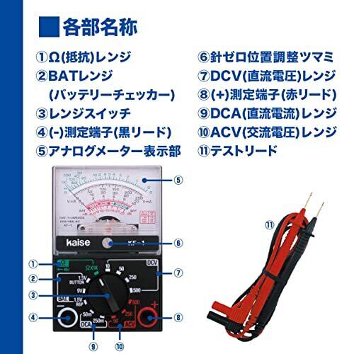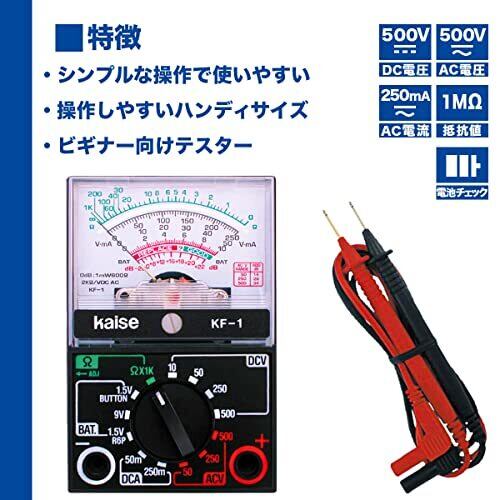 電力:単三形乾電池×1本 直流電圧:10/50/250/500V(2kΩ/V) 交流電圧:10V/50/250/500V(2kΩ/V) 直流電圧:50/250mA 抵抗:×1kレンジにて0~1MΩ