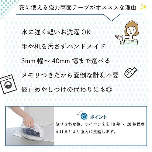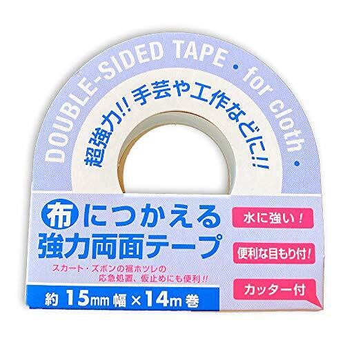 布によくつく両面テープです。 貼りつけた後、アイロンを10秒から20秒程度かけるとより強力に接着します。 繊維に浸透しやすい特殊粘着剤を使用しているので、布どうしを強力に貼り合わせることができます。 カッター付き、便利な目盛付き サイズ:15mm幅×14m巻 基材:不織布、粘着剤:アクリル系、はくり紙:紙 【日本製】