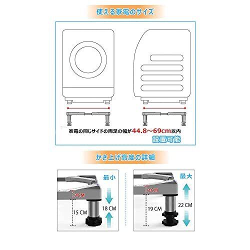 【2022版新設計】従来版の4足洗濯機置き台を改良した最新設計。①材料改良:PP製足→PP+ステンレスのジャッキ ②増高:15-22cm高さ調節 ③増大:ジャッキの直径6.5cm、耐加重は500kgまで達成 【寸法(調節可能)】:幅/奥行き:44.5~68cm、高さ:18cm-21cm 重量:約2.5kg 耐加重:約500kg 【安定性アップ】:新設計のジャッキ4本が付き、より頑丈なり耐加重もアップ。洗濯機が運作する時動きません。安定感抜群!床から高さを作り、掃除するときに便利です。高さ最大17cmアップなので、家電下の掃除が便利、排水もスムーズです。 【防振コムパッドが付き】:滑りを防ぎ、洗濯と脱水時の振動と騒音を吸収できるEVA製防振パッドが付属しています。 【サイズ調整改良】:ネジでパイプの固定は不要、ロックを押すだけでサイズが簡単に調節できます~