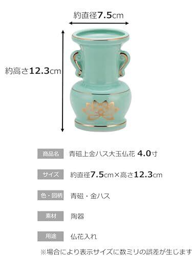 商品サイズ:約7.5×7.5×12.3cm 商品重量:約269g 色:青磁 金ハス 素材:陶器 ※御仏具は製造工場の関係で多少図柄が変更になることがございますので、ご了承ください ※在庫の状況により、記載とは少々異なるサイズの商品が届く場合がございます。あらかじめご了承ください。