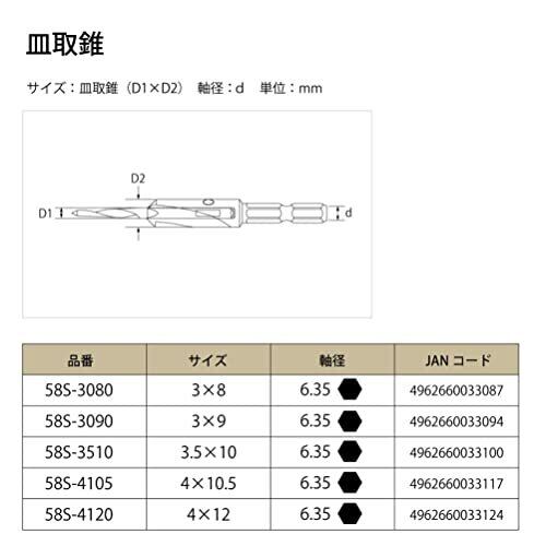 サイズ:3(下穴)×8(皿取) 軸径:6.35mm六角軸、皿角度:90度 材質:普通鋼・メッキ仕上げ 適用材:一般木材、適用機種:インパクトドライバ14.4V以上・ドリルドライバ14.4V以上・電気ドリル 適正回転数:3,000回転/分以下