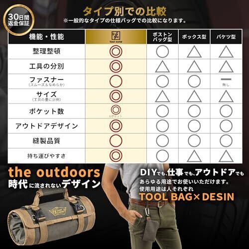 ✅【ロール式工具バッグの説明】欧米では広く普及している工具バッグです。数秒でロールにできます。広げるのも数秒です。見た目以上に収納量があり、使い方は、工具をポケットに入れ、端からくるくると巻いて使います。欧米では広く普及している工具バッグです。 ✅【サイズ】広げると縦50㎝ 幅32㎝、工具収納部は横30cm、ポケットの高さは8cmです。 ✅【耐水性】素材はオックスフォード900Dというテントにも使われる素材を使い、耐久性、耐水性のある素材。軽い水なら耐えられる防水性。色はベージュ×ダークグリーンのツートンになります。 ✅【持ち運びが簡単】クルっと丸めてコンパクトになるので持ち運びが楽です。持ち運ぶ際、バックル調整ベルトは緩みにくいように改良しています。 ✅【使いやすい工夫】小型ポーチ2つはズボンのベルト通しなどに掛けることも可能、持ち運ぶ時はコンパクトで、広げれば欲しい工具がサッっと取り出せるように使い勝手よく作られています。時短になります。