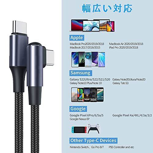 【100W急速充電】最大100Wの高出力に対応し、ノートPCやタブレット端末、スマートフォン等の幅広い機器にフルスピード充電が可能です。L字のType cケーブル設計、頻繁にプラグを差し込んでも断線できません。(※本製品はデータ転送及び充電にのみ対応し、映像出力には対応しておりません。) 【安全な保護機能搭載】優れたE-Markerスマートチップ,最も安全な100Wの急速充電を実現する最先端のスマートチップです。過充電、発熱と短絡を防止するE-markerスマートチップを搭載し、安定性の高い急速充電と大切な機器の損傷防止を実現します。 【優れたの高耐久性】3重に編み込まれた高耐久ナイロンを採用、ケーブルの強さと柔らかさを両立し、コード部分はねじれや折れに強く、断線しにくい。10,000回以上の曲げ試験と10,000回以上の指抜き試験にに合格しており、耐久性にとても優れております。 【幅広い対応】強力な100 W出力により、普通60 Wケーブルよりさらに幅広いデバイスを充電できます。すべてのUSB C携帯機種、タブレット、それにほぼノートブック、Nintendo Switchなどにも対応できます。また、このAndroidデータケーブルは最大480Mbpsのデータ転送速度を持ち、20秒で1GBファイルを転送できます。 【品質保証】万が一故障発生したら、お気軽にご連絡ください。誠心誠意にご対応させていただきます。「注文履歴」→「出品者に連絡」から弊店までにご連絡ください。
