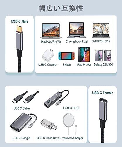 【USB C延長&10Gbpsデータ転送&4K@60Hz高解像度】Type C 延長ケーブルとしては、転送速度と安定性を向上させるために設計されています。USB 3.1 Gen2、4K オーディオ/ビデオ 10Gbps信号転送と最大20V/5Aで充電します。データ同期も可能です。ご注意:10Gbpsは理論上の最大転送速度ですが、実際の速度はパソコンや線材などの影響を受けますので、実際の伝送速度を基準にしてください。▲ Type Cスマホを使用する場合、本体はDP Alt機能に対応する必要があります。 【100W急速充電】USB Cケーブルは最大20V/5A (100W)まで安全かつ安定して出力できます。自宅用、職場用、旅行用などいろんな場所で大活躍しています。▲充電器と接続する機器がPD対応している場合に限ります。 【安全な保護機能搭載】優れたE-Markerスマートチップ,最も安全な100Wの急速充電を実現する最先端のスマートチップです。過充電、発熱と短絡を防止するE-markerスマートチップを搭載し、安定性の高い急速充電と大切な機器の損傷防止を実現します。 【優れたの高耐久性】アルミニウム合金素材を使用して、3重に編み込まれた高耐久ナイロンを採用、ケーブルの強さと柔らかさを両立し、コード部分はねじれや折れに強く、断線しにくい。10,000回以上の曲げ試験と10,000回以上の指抜き試験にに合格しており、耐久性にとても優れております。 【幅広い対応性】USB-Cに対応したスマートホン、ゲーム機、パソコン及びその他のデジタル端末に対応します。MacBook Pro 14" 2021、MacBook Pro 16"、MacBook Pro 15.4"、MacBook Pro 13.3"、MacBook Air 2018-2020、MacBook 2015-2017、iPad Pro 2018-2020、iMac(2020)/iMac Pro/Mac mini(2018)、Surface、Switch、Xperia、Galaxy、Pixel等Type C機種対応。