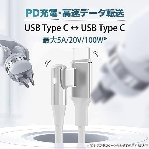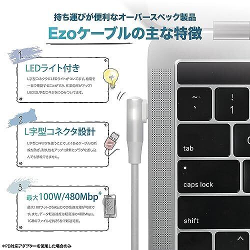 Ezo L字型USB Type C-C ケーブル 90cm LEDライト付き 5A/20V/100W 高速充電 L型 USBCケーブル 保護チップ内蔵 Samsung iPhone15以降 Macbook 対応 (ホワイト)