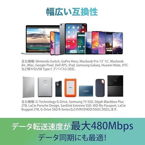❶【100W超高速充電に対応】USB Type-C PD 規格に準拠したケーブルは、最大100W (20V*5A)の出力が可能。大電流で接続機器への安定給電が可能です。 2時間で新しいMacBook Pro 13インチを満充電できます。自宅用、職場用、旅行用などいろんな場所で大活躍しています。▲PD充電を実現するために、デバイスとアダプタはPD機能をサポートする必要があります。※ご使用のデバイスにより供給スピードが異なります。※モニタや映像出力などに対応不可。 ❷【LEDライト付きL字型コネクタ】コネクタ部分にLEDインジケーターがついているので、給電を一目で確認でき、作業効率を1秒ずつ短縮。暗闇でも簡単にケーブルを見つけることができます。また、L字型コネクタ設計のため断線の確立が低く耐久性がアップ。 ❸【USB2.0データ伝送】USB2.0規格に対応し、最大480Mbpsでの高速データ転送が可能です。これまで転送に何十分もかかっていた映画などの大きいデータでも数分で転送完了します。 ❹【E-Mark チップ搭載】E-Mark チップの充電保護システムにより、接続された端末の入力電圧を自動検知し、最適の出力により安全且つ急速給電でき、過充電、発熱などから大切な機器を守ります。 ❺【優れた耐久性】L字型コネクタ部はアルミニウム合金にニッケルコーティングがなされており5000回の抜き挿し試験をクリアし、距離でも高解像度での安定した信号伝送を実現します。50Nの引っ張り強度試験、10000回以上の折り曲げ試験に合格し、一般的なUSBケーブルより寿命を4倍以上に向上する高耐久Type C ケーブルです。高耐久ネット材料により衝撃、割れ、錆びに対し強度が極限まで高められたケーブルです。 ❻【12ヶ月の保証期間】:当店でご購入の製品は12ヶ月間の保証サービスをご提供しております。不具合が発生した場合はお気軽にお問合せください。