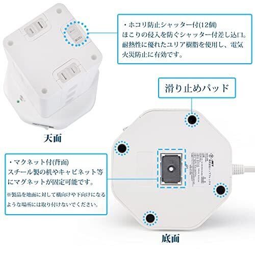 「タワー型省スペース」新型のタワー型デザインのTOP-FLEX電源タップには12個のAC電源口と4つのUSBポートがございます。タブレットやスマホ、パソコン、小家電など同時に複数のデバイスに接続することが可能です。底面にゴム製のフットパッドを採用し、滑りにくく、数多くのプラグの重さにも耐えられ、倒れにくく、卓上や床 に置いて安定性に優れています 「間隔幅広&コンセント分岐」電器の配線や電源ケーブル、USBケーブルなどの集約ができって、配線がすっきりしました。AC挿入口は幅広設計で、アダプタが互いにじゃまにならず挿入できます。部屋に置いても違和感がなく、インテリアの一部として設置いただけます。 「PD急速充電対応・最新iphone13に急速充電可能」このコンセントは1つPDポート+3つUSBポートを付きので、急速充電を実現します。PDポートは最大20Wの急速充電を対応して、5V/1Aのポートより充電速度が10倍速いです。USBポート合計最大3.4A出力(※急速充電を実現するために、別売のUSB-C充電ケーブルが必要です。AndroidはType-C to Type-Cケーブルを利用し、IOSはType-C to lightningケーブルを利用が必要です)。 「雷ガード機能&過負荷保護」高性能雷サージ吸収素子(バリスタ)を内蔵し、サージ保護機能が正常に動作して いる時に、緑ランプが点灯し、落雷から電子機器への被害を防止できます。また、過負荷保護ブレーカーも内蔵さ れ、過熱、過電流、ショートなどからデバイスを守ります 【幅広く活躍】マルチ機能で、2mの延長コードも搭載し、使い便利なoaタップです。テレワーク、在宅勤務、室内 、会社、自宅、オフィス、会議室、パーティーなど幅広く活用できます。また、インテリア、引っ越し祝いのプレゼントと してもお勧めします