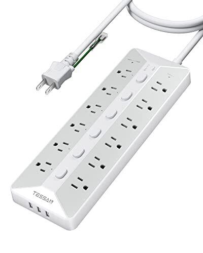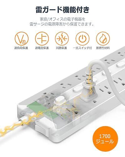【12個のac差込口付き】6個常時オン差込口は一括スイッチのみに制御されます。6個独立切り替え差込口は一括スイッチと個別スイッチが同時オンになる場合に、オンになります。合計12個ac差込口が付いています。差込口の間隔は38.5mmで、広くて、お互いに干渉しないです。AC差込口は3ピン式で、3ピンプラグが採用されているOA機器をアダプタなしで接続することができます。オフィスでの使用に適しています。 【スイッチ付き電源タップ 】一括スイッチ及び6個個別スイッチが付いています。一括スイッチは12個のac差込口と3個のusbポートに電力を供給します。過負荷が発生すると、自動的に電源がオフになります。個別スイッチは6個のac差込口を個別に制御して、使用しない時に電力を節約できます。 【usbスマート充電可】このusb 電源タップは三つのtype-aポートがあります。単一usbポートは5V 2.4Aで、3個usbポートは合計5V 3.0Aになります。理想的な出力でインテリジェントに充電します。 カメラ、スマートフォン、タブレット、パワーバンクなどに最適です。Qualcomm Quick Chargeはサポートされていません。 【安全便利に使用可】6個電源インジケータが付いて、独立切り替え差込口は電源に接続されている時に、点灯します。また、接地LEDインジケータも付いて、電気配線が適切に接地されている間、インジケータが点灯します。なお、雷ガードLEDインジケータが付いて、サージ保護機能が正常に動作している場合に点灯して、家庭/オフィスの電子機器を雷サージの電源障害から保護できます。 【使用者の便利に配慮】このusb コンセント タップ(アース付き電源タップ)の底面にはゴム製のフットパッドが4つ付いているので、滑りを防ぎます。また、壁掛け用フック穴も4つ付いていて、このタコ足コンセントを、作業台、壁掛け、床置き、カウンターなどの下に安全に取り付けることができます。なお、3m延長ケーブルを採用して、コンセントから少し離れた場所でも利用できます。