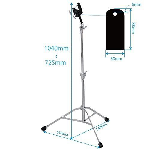 【サイズ】高さ:725~1,040mm、クランプサイズ:88x30x45~20mm、重量:2kg 【シングルレッグの3脚タイプ】安定感を確保しながら軽量化を実現。高さは725mmから1040mmまで調整可能で、演奏スタイルに合わせて最適な高さに設定できます。 【他社製ボンゴにも対応】厚さ25mmから45mmまでの他社製ボンゴも使用可能。幅広い楽器に対応できる汎用性の高いスタンドです。 【高い安定性】高さ固定部はドラムスタンドと同じ機構を採用。角度調整も可能で、より安定感のあるプレイを楽しむことができます。