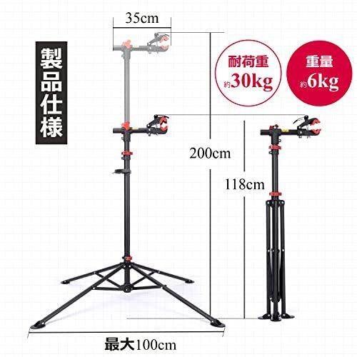【耐荷重30kg】メンテナンスや洗車に最適な整備スタンド。 【安定感抜群】しっかりと自転車を支える大きめの4本脚を採用。 【高さ・角度調節】作業しやすい好みの高さ・角度に固定可能。 【折りたたみ可能】移動や保管に便利な折りたたみ式。 【専用工具トレー付き】メンテナンス時に便利な工具皿を標準装備。