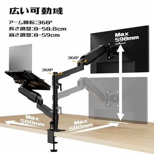 【デュアル式・トレイ付き】ガススプリングアームが二本付きで、15ー27インチのモニターを2台で同時に配置できます。そして、ノートパソコン用のトレイも付属しており、11-17インチのノートパソコンに適用します。トレイの左右には、固定用のフックが付き、ノートパソコンをしっかり掴みます。トレイのフックにはケーブル収納用のホルダーがあり、配線が更にキレイになります。また、ゴムパットも2つ配置し、パソコンを支えて、傷から保護できながら、放熱性にも優れます。 【角度・高度調整】トレイもしくはVESA部は上下左右に調整できるデザインを採用しております。上に85°で下に90°のチルト調整ができて、左右にも各180°の調整ができ、どの姿勢で本製品をご利用になってもノートパソコンの画面が見られます。それに、アームを調整し、画面をシェアするときも便利です。アームの部分にはガススプリングがあり、ノートパソコンの重さにあわせて、張力を調整し、高度の調整も便利です。ガススプリングの張力調整及び360°回転可能で2つのモニター画面を好きなように組み合わせることもできます。また、支柱にはストッパが設けられ、アームの転倒防止や防震ができます。 【取り付け簡単】取付方法にはグロメット式とクランプ式2つがあります。グロメット式は穴のある机を利用している方に適用します。机に穴のない場合は机の端にクランプ式で取り付けても可能です。グロメット式には厚さ60mm以内のデスクに適用し、クランプ式には厚さ85mm以内のデスク適用します。また、VESA規格は75*75mmと100*100mmの2種類があり、様々な規格のモニターに取り付けられます。普通のモニターだけでなく、湾曲モニターも取り付けられて、スペーサーと長さが異なった2種類のネジが同梱物に入っており、実際の状況に合わせて適切なネジを選んで取り付けてください。 【ケーブル収納】トレイだけではなく、2つのアームにもケーブル収納用の溝があります。更に、パッケージにも取り出せるケーブルクリップが付属しており、支柱に取り付ければ、モニターやノートパソコンなどの機器に接続するケーブルがあっちこっちに垂れることがありません。すべての配線とケーブルをきれいに整理できます。 【高品質の素材・省スペース】アルミ合金素材と高品質のABS素材を採用しており、従来品よりより耐久性が優れる、ノートパソコンやモニターなどの機器もしっかり適用できます。ノートパソコンやモニターをガススプリングアームにかけて、机上スペースはより広くなり、卓上の空間をもっと効率的に利用できます。取り付け用に必要なツールが全部付属し、日本語取扱説明書もあります。取り付ける前に、ぜひ取扱説明書をご覧になってください。