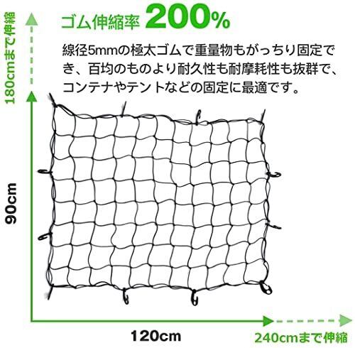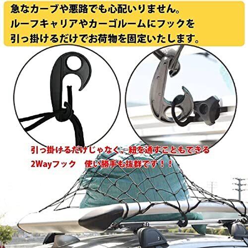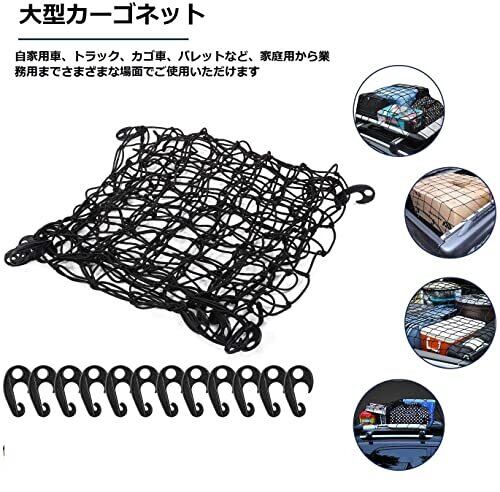 【車用 カーゴネット&2.5 mの荷締めベルト】】荷締めベルトは安心の2.5mで、お客様の声を元に設計された長さを是非お試しください。2本付属しておりますので、合わせて5mの1本としてのご利用も可能です。カーゴネット単品では荷崩れの可能性がありますので、付属の荷締めベルトでより強固に固定しましょう。大事なお荷物に傷がつかない安心感を貴方に。 【2倍伸縮可能】このゴムネットだけでも十分な耐久性を確保しています。カーゴネットは200%の伸縮性でネット90×120cmは180×240cmまで伸縮可能です.すごい収納力を備え、容量以上に収納、大きな荷物が崩れずに搭載、バッゲージなどの転倒、落下を防止し、しっかり固定、保護できます。 【高品質】カーゴネットは線径5mmの極太仕様。ABS製2WAYフック(12個)が付属、丈夫で負荷力高く、取り外しも可能、安定性が高いトランクネットです。ネットだけでも十分な耐久性を確保しています。カーゴネットはラテックスとゴム製で、独特の臭いがある場合がございます。※風通しのいい場所で陰干し、あるいは手洗い洗濯をすることで匂いを大幅に抑えられますのでお試しくださいませ。 【簡単装着】伸縮性があるので、付属の12個のフックで引っ掛けるだけの簡単装着!収納網のフックを四角の固定位置まで吹き込む、簡単にインストールできます。 【多種用途】トラックカーゴネットは、かさばったり奇形の貨物を保持するように簡単に設定できます。ピックアップ、トラック、トレーラー、SUV、トヨタタコマ、ATV、UTV、ルーフトップラゲッジラック、カーゴヒッチラック、ボートなどに広く使用されています。