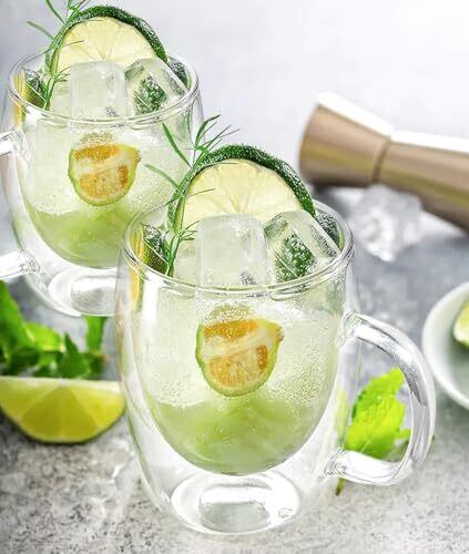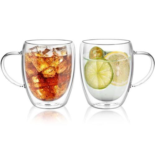 ダブルウォールグラス 350ml 2個セット 保冷 保温 耐熱 二重 グラス ダブルウォール コップ 結露しないグラス 二重グラス アイスコーヒー グラス マグカップ ガラス 二重構造 二重ガラスコップ 2重 グラスコップ ティーカップ タンブラーグラス 透明 おしゃれ シンプル (350ml, ハンドル付き)