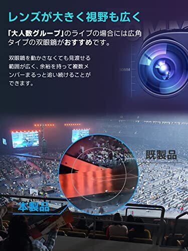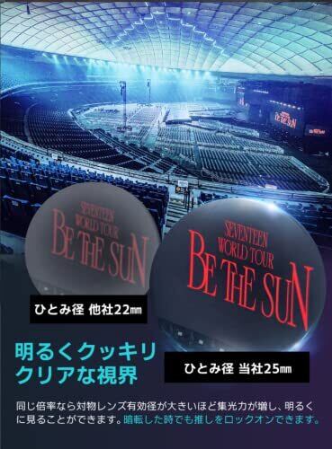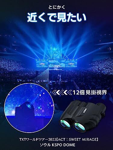 【どの席でも満足に推しを見れる】コンサートで少しでも近くから尊い推しを眺めたい。そんな願いを叶える双眼鏡が登場!アリーナやドームなどの大きい会場で手持ちの双眼鏡で手ブレを気にせず見れる倍率、それが12倍です。分かりやすく言うと、100メートル先の推しを10メートルの距離から見ている感覚です。10メートル先だと88センチの距離になります!」 【肝心のレンズは?】オペラグラスの口径やひとみ径は明るさに影響しており、数値が大きいほど暗い場所でも対象物を明るく見られます。25mmという大きな対物レンズにより、光の損失を抑え明るく広いを視界を確保。暗くなりがちな屋内会場でも、臨場感あふれる明るい視界を楽しむことが出来ます。双眼鏡を動かさなくても見渡せる範囲が広く、余裕を持ってダンスフォーメーション移動する時の推しを追い続けることができます。 【片手で持てるミニサイズ】たったの258g。一般的なボトル缶コーヒー(400ml)よりも軽い。女性の手のひらにのるコンパクトサイズです。ポケットに入るくらい小さくて、片手で持てるコンパクトなオペラグラス。ペンラやうちわなどの参戦グッズを持ちながらでも同時に使えるほど手軽です。長時間のライブでも軽いから疲れない!思う存分、推しをじっくり眺められます。 【推し活応援!ライブ特化型】首と肩への負担を減らす幅広ストラップ(1.5cm)付き、さらに快適に双眼鏡を携帯できます。簡単に取り外しが可能です。遠征等でも持ち運びしやすく、長時間使用しても疲れにくいため、快適にライブを楽しむことができます。頬骨にフィットするアイカップ、迷光によって発生する視界のフレアもシャットアウト。 【使いやすさを重視した快適な操作性】ピントリングは回しやすく指が滑りにくい大型転輪を採用。優れた操作性を得られます。一度視度を調整すれば、目標物が変わっても中央のリングを回すだけでOKです。指1本で簡単に素早くピント調整が可能。見たい瞬間は一瞬、大事なシーンを逃さないで観測できる。人によって異なる左右の視度差を合わせる"視度調整"機能が付いている。眼幅調整も広めの設計だから、子供や小顔さんもしっかり推しを捉えられる♪