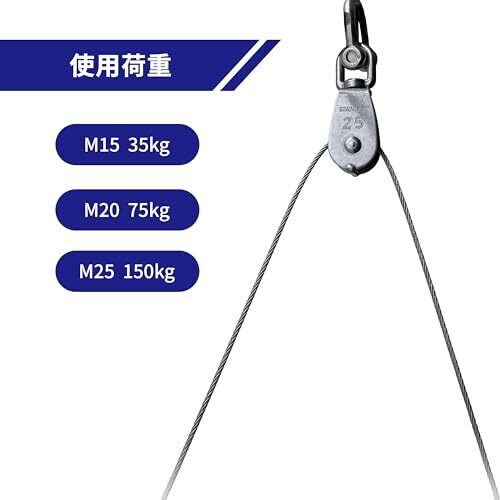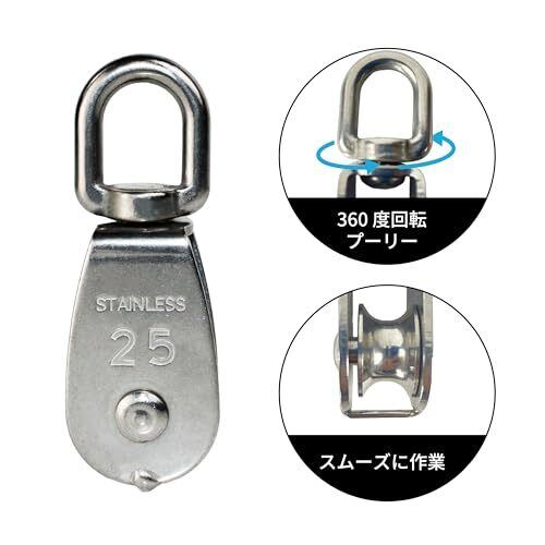 【サイズ】M25 6個セット、使用荷重150kg(使用荷重を超えないようにしてください)。安心して使用でき、幅広いニーズに応じた強力なサポートを提供します。 【材質】優れたステンレス材質を採用し、実用性が高くて用途も広く、錆びにくいし、丈夫で長持ちします。長期間の使用に耐える耐久性を保証し、厳しい環境下でも性能を維持します。 【スイベル式】プーリーは360度回転するので、方向を変える手間がなく、簡単に方向転換できます。作業中のロープの絡みを防ぎつつ、任意の方向へのスムーズな荷物の移動を可能にします。これにより、作業の効率が向上し、時間と労力を節約できます。 【作業率向上】重い物でも軽い力で楽々持ち上げられます、作業率がアップしています。プーリーは 360 度回転して力の方向を変えることができ、機械的な利点をもたらします。簡単で迅速な取り付け、誰でも簡単にプーリーを設置します。 【用途】産業持ち上げ、貨物輸送、フロープツールの牽引に広く使用されています。プーリーはその頑丈さで、様々なシナリオでのニーズに応えます。
