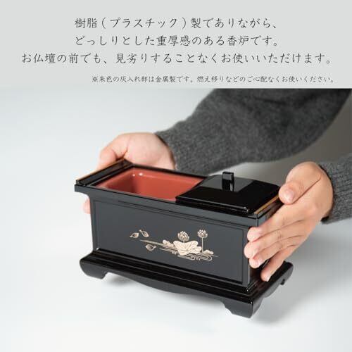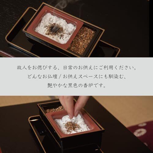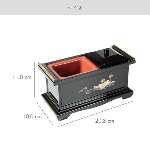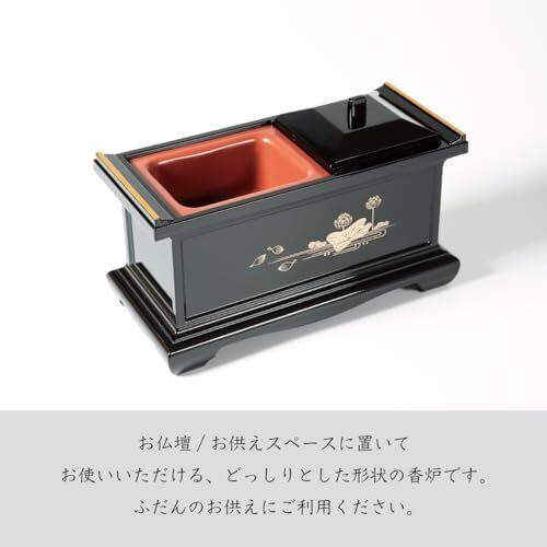 【Made in Japan】日本の住環境に合わせて作った、日本製の仏具をお届けいたします。 サイズ:外寸サイズ 幅 約209mm 高さ 約110mm 奥行 約95mm お仏壇・お供えスペースに置いて、ご使用いただけます。 職人の手仕事で塗装を行ない、艶のある質感に仕上げています。 灰入れ・焼香入れ・蓋がセットになっています。