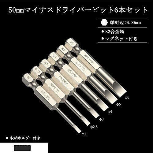 6本 マイナスドライバービットセット 50mm S2鋼 磁気マイナスビットセット 2mm-6mm 電動ドライバービット ねじ締めドリル用ドライバービット 6.35mmシャンク インパクト対応 (50mm)
