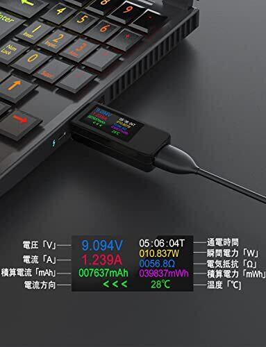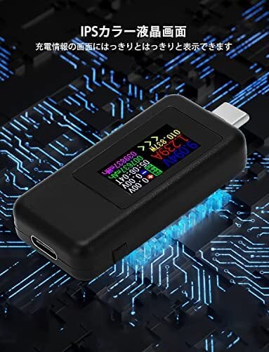【USB-Cチェッカー】新のUSBC電圧/電流/積算電流を簡単にチェックする装置です。 【商品測定機能】USBC電子機器の電圧・電流・通電方向・通電時間・ワット・積算電流・内部温度を簡単にチェックできる装置です。測量範囲4.0~30V 0~5.10A。電子製品の安全を守ります。 【コンパクトの便利】このUSBはコンパクトなデザインで、 55*26*11(mm)重さ:15g どんな場所でもお手軽に持ち運びができます。 【IPSカラー液晶画面】このType-c テスターは0.96インチのIPSカラー液晶画面で、すべての充電情報が画面にはっきりとはっきりと表示され、便利で実用的です。 ご注意してください、この製品の表面は、選択的に除去できる透明な保護フィルムで覆われています。 【操作簡単】ボタンを1回クリックします。循環的に画面を切り替えることができます。ボタンをダブルクリックすると、表示内容が回転して見やすくなります。 【ご注意ください】 ①Type-C出力インターフェースは、ディスプレイが点灯する前に急速充電デバイスに接続する必要があります。 入力ポートを別途差し込むと、ディスプレイが点灯しません。②2回、3回と素早く押すなどの操作を容易にするため、ボタンが一部緩んでいます。製品の品質上の問題ではありません。ボタンを押せない状況が発生した場合は、ボタンを軽く押し、前後に押してみてください。