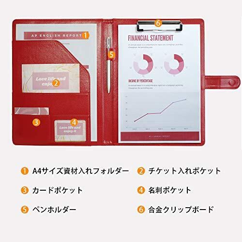 このポートフォリオは、フォルダおよびクリップボードの機能を組み合わせた商品として、書類を保存するほか、持ちながら書くこともできます。 寸法 32 cm ×25 cm サイズで気軽にA4サイズの薄いシートまたは書き込みパッドを収納できます。(紙とペンは含まれておりません) 右側のクリップボードが堅くで頑丈、心地良くスムーズに書けます。およそ50〜80ページの紙を収納できます(約1cm高さ)。一般的な標準のクリップボードと比べ、紙をカバーすることによってプライバシーを守れます。 ポートフォリオとして、中には様々なポケットや透明のスロットがあり、ノートや書類、タグ、メール、領収書および名刺を効率よく収められます。 品質の高い人工皮革/PUレザーによって作れられ、よく縫われています。気軽にパソコンケース、ハンドバックやリュックにおき、日常生活以外ビジネスシーンにも使えます。よりプロフェッショナルのように見られますし、面接やビジネス会議、そして働く現場にも役立ちます。